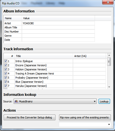 This step is entirely optional, but is recommended. Here you can either fill out the info yourself if it doesn't exist, or if its a well known CD, you can use Musicbrainz's database by the lookup button
