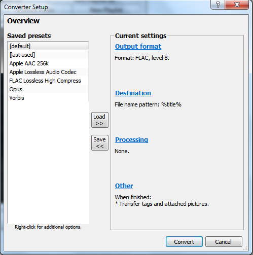 5. Done! If you need to convert to lossy just use the same converter by right clicking the track in Foobar2000 and click the dots, then specify format and folder.