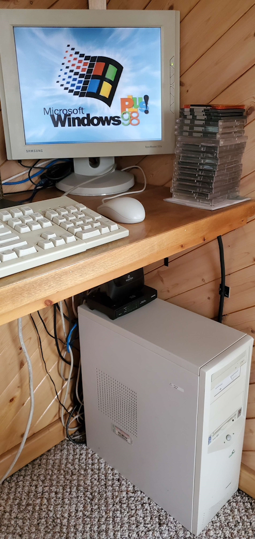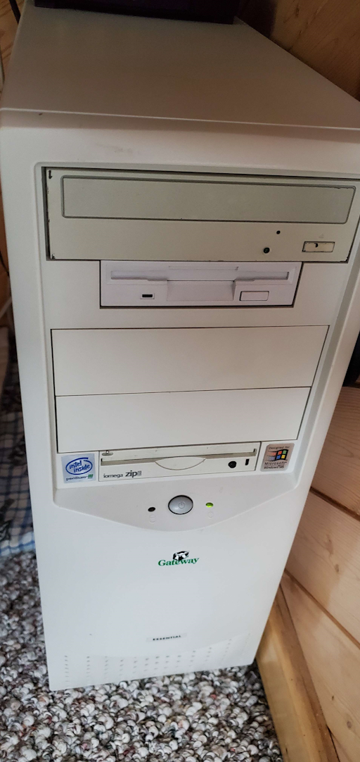 Here is my restored Gateway Essential 450! I got it from a friend who's parents had it in their office in a desk cabinet they haven't touched in ages. When he went to pick it up, IT WAS STILL ON. He was going to toss it but I said I'd take it. I got it home, cleaned it up and ran a test on it. The drive was dead, click of death. I put in a SATA drive using an IDE to SATA adapter and started adding operating systems. I then added cards to it. Hardware specs and parts I've added below.