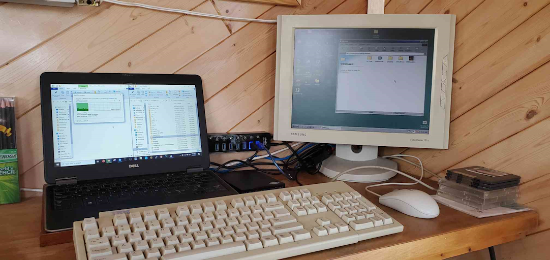 I use a VGA splitter with a USB VGA Capture device to stream my retro PC and record videos. The laptop there is transferring files to a shared drive on the Gateway.
