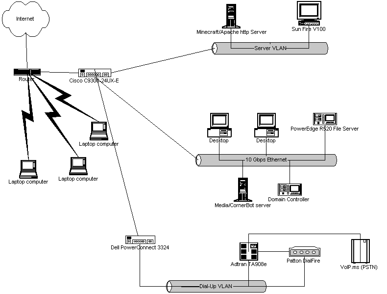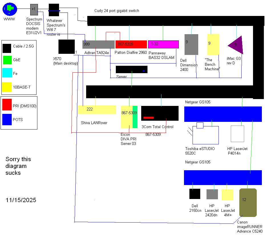That said, here's an accurate, but terrible depiction of my network done in MS Paint. Enjoy and feel free to laugh, but I have professionally installed structured cabling :D
